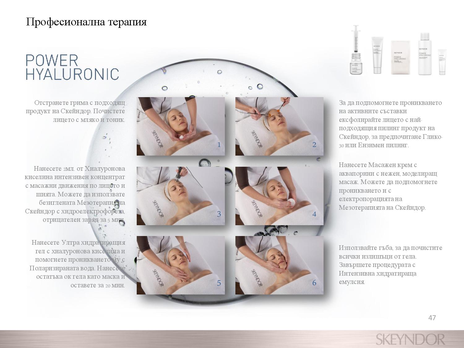 Хиалуронова киселина се препоръчва за всяка възраст Терапията Хиалуронова киселина се препоръчва за всяка възраст, не зависи от сезона, слънчевото греене или георграфската ширина. При млада кожа от 20 години нагоре се комбинира успешно с терапия Витамин С + по време на есенния и зимен сезон. Може да се ползва самостоятелно или като подготвителна терапия за увеличаване на хидратацията и балансиране на хидродинамичните процеси в кожата. Цялостна грижа при зряла кожа с повехнал вид, бръчки от дехидратация, потъмнен тен, суха, дехидратирана кожа, лющене, петна. При дами на и над 35-40 години терапията успешно се съчетава с терапиите на Скейндор Коректив и Глобъл Лифт.