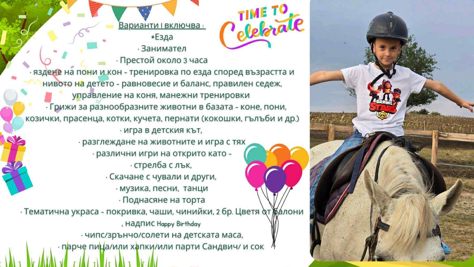 Празнувайте незабравим рожден ден сред природата! Предлагаме различни пакетни варианти за организиране на детски рождени дни, съобразени с възрастта на децата, броя на гостите и вашите предпочитания. Включваме игри на открито, възможност за среща с животните във фермата, забавления в детския кът, както и опция за езда Може да избирате между базови и разширени пакети, които включват храна, декорация, анимация и допълнителни активности. Нашият екип ще се погрижи за всичко, за да може празникът да бъде истинско преживяване както за децата, така и за родителите.
