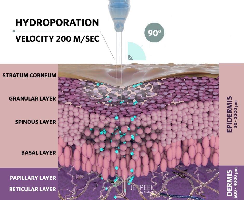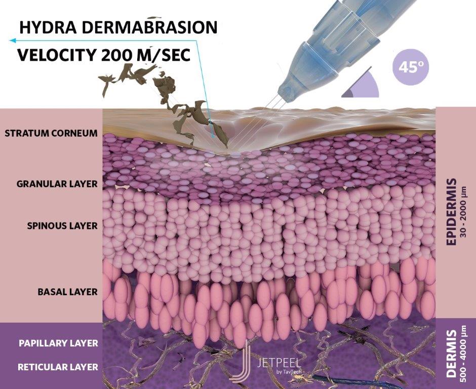 JetPeel е иновативна Израелска технология на TavTecH разработена специално с цел подобряване състоянието на кожата и решаване на конкретни естетични проблеми, по възможно най-ефективен и в същото време неинвазивен метод. Методът работи на принципа на барофорезата, която чрез голяма скорост (200 m/s) отваря в кожата финни микроканалчета и инфузира в дермалните слоеве различни коктейли от активни вещества. Ефективността и резултатите са идентични с тези на иглена инвазивна мезотерапия. JetPeel въздейства на кожата в три основни и най-важни направления за нейната регенерация: Лимфен дренаж – детоксикиращата вода със сребърни йони стимулира микроциркулацията, оттича лимфата в засегнатите зони,подготвя кожата и подлежащите тъкани за следващата стъпка на процедурата. Ексфолиация – специфичните ексфолиращи движения и комбинацията от АНА И ВНА киселини, отстраняват повърхностния слой мъртви клетки и полират прецизно кожата. Това придава изключителен блясък и подготвя епидермиса за проникването на активните съставки от серумите Субдермална инфузия – магичната струя инфузира безболезнено подбрани според типа и нуждата на кожата коктейли от серуми. Всеки комплекс съдържа уникална патентована формула от активни съставки с различно биологично въздействие. RENEWAL COMPLEX 1 – съдърга 5% гликолова киселина, витамин В5 и алое. Подходяща за леко до средно ниво на ексфолиране при нормална и чувствителна кожа, при пигментация, възрастови и соларни петна, акне и мазна кожа. RENEWAL COMPLEX 2 – съдържа 10% гликолова киселина, витамин В5 и алое. Подходяща за средно до дълбоко ниво на ексфолиране при нормална и плътна кожа, при пигментация, възрастови и соларни петна, акне и мазна кожа. RENEWAL COMPLEX 3 – съдържа 16% гликолова киселина, витамин В5 и алое. Подходяща за средно до дълбоко ниво на ексфолиране при плътна кожа, при пигментация, възрастови и соларни петна, акне и мазна кожа. RENEWAL COMPLEX 4 – съдържа бадемова, салицилова и маликова киселина за нежно ексфолиране. Подходяща за чувствителна кожа, през летните месеци, като пилинг за моментален блясък, не предизвиква фоточувствителност, акне и мазна кожа.