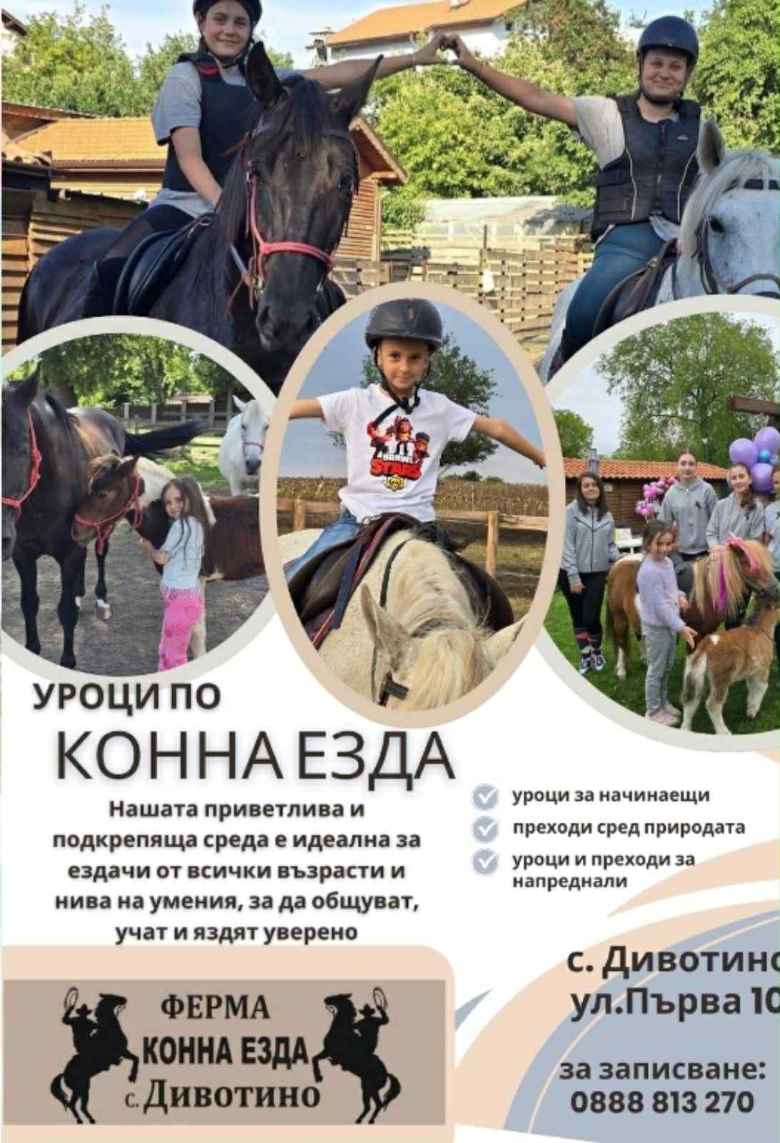 Разполагаме с професионални инструктори по конна езда, които ще ви въведат в магията на конния спорт. Организираме конни преходи в Дивотинския балкан – както на кон, така и с впряг (бъги-маратон). Маршрутите преминават през живописни пътеки на Люлин планина и водят до множество красиви и спокойни места в региона. Цените се определят според продължителността на прехода.