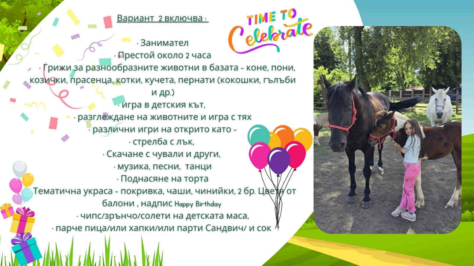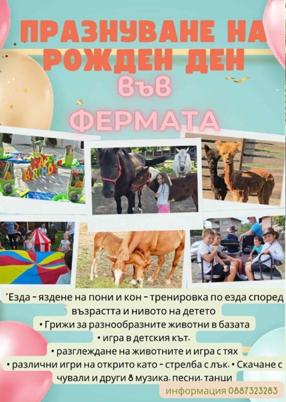 Празнувайте незабравим рожден ден сред природата! Предлагаме различни пакетни варианти за организиране на детски рождени дни, съобразени с възрастта на децата, броя на гостите и вашите предпочитания. Включваме игри на открито, възможност за среща с животните във фермата, забавления в детския кът, както и опция за езда Може да избирате между базови и разширени пакети, които включват храна, декорация, анимация и допълнителни активности. Нашият екип ще се погрижи за всичко, за да може празникът да бъде истинско преживяване както за децата, така и за родителите.